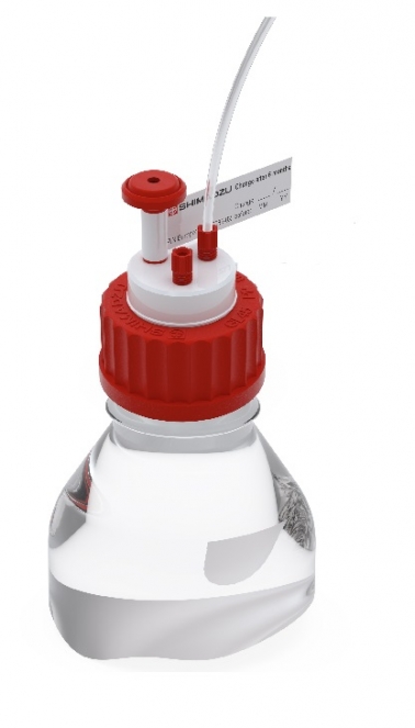 Shimadzu Solvent Caps hermetically seal all laboratory bottles with GL45 thread and ensure safe inflow and outflow of HPLC solvents via capillaries with OD-ø 3.2 mm.