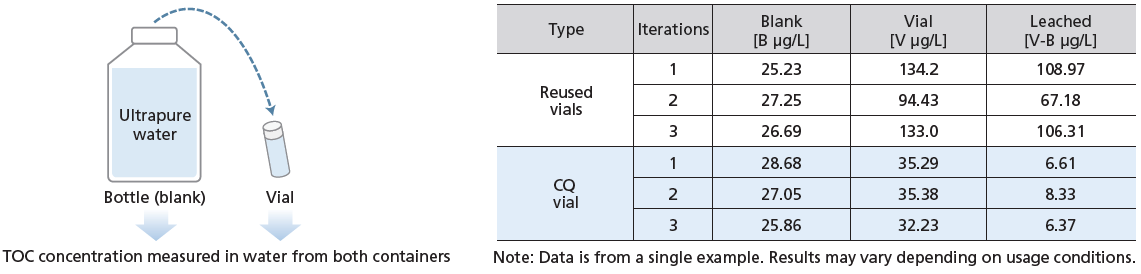 CQ vial were significantly more effective at inhibiting leaching than the vials cleaned in the cleaning machine. Therefore, the use of CQ vial should be considered not only by customers measuring pure water, but also by customers that want to avoid contamination during vial cleaning, drying, and storage, and customers looking to save the time and space required for cleaning, drying, and storing vials.