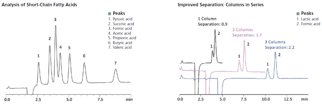 Because the column design is optimized for the high-speed analysis of organic acids, even short-chain fatty acids such as valeric acid are eluted within 10 minutes. If separation with one column is not enough, up to three Shim-pack Fast-OA columns can be connected in series to improve the separation