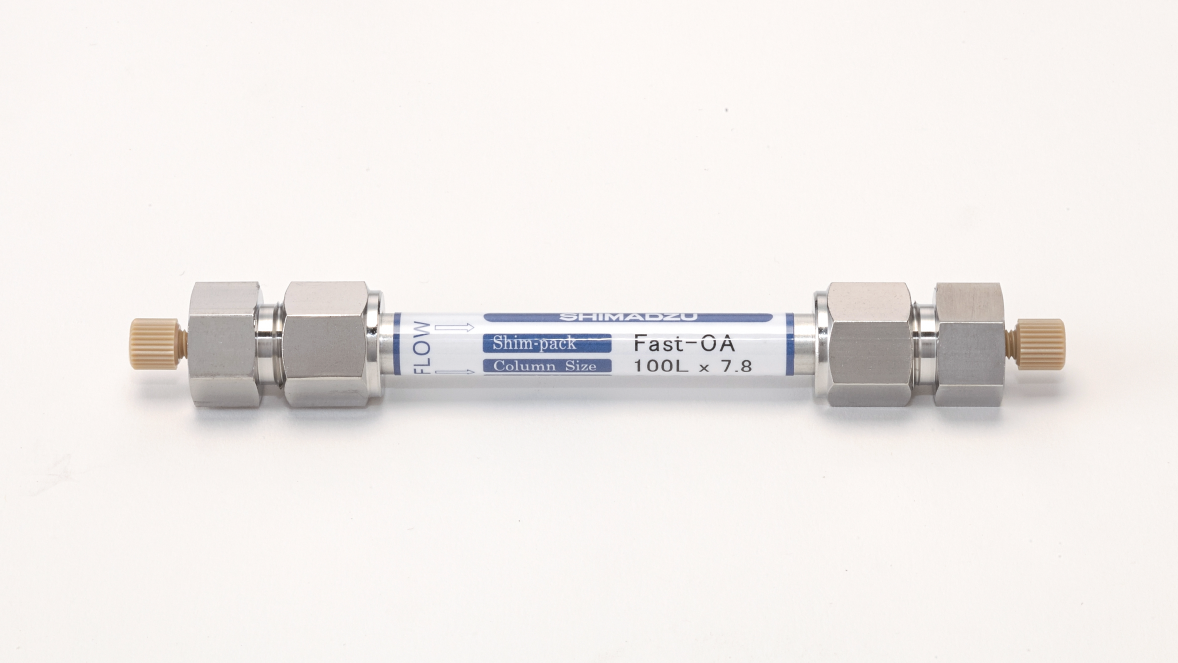 Shim-pack Fast-OA columns are packed with an ion-exclusion polymer, and utilizing an acidic mobile phase, can separate mixture solutions based on the pKa value of each sample component. The Shim-pack Fast-OA is a column for the high speed analysis of organic acids. It can separate multiple organic acids in a short time and supports real-time monitoring of their concentration levels.